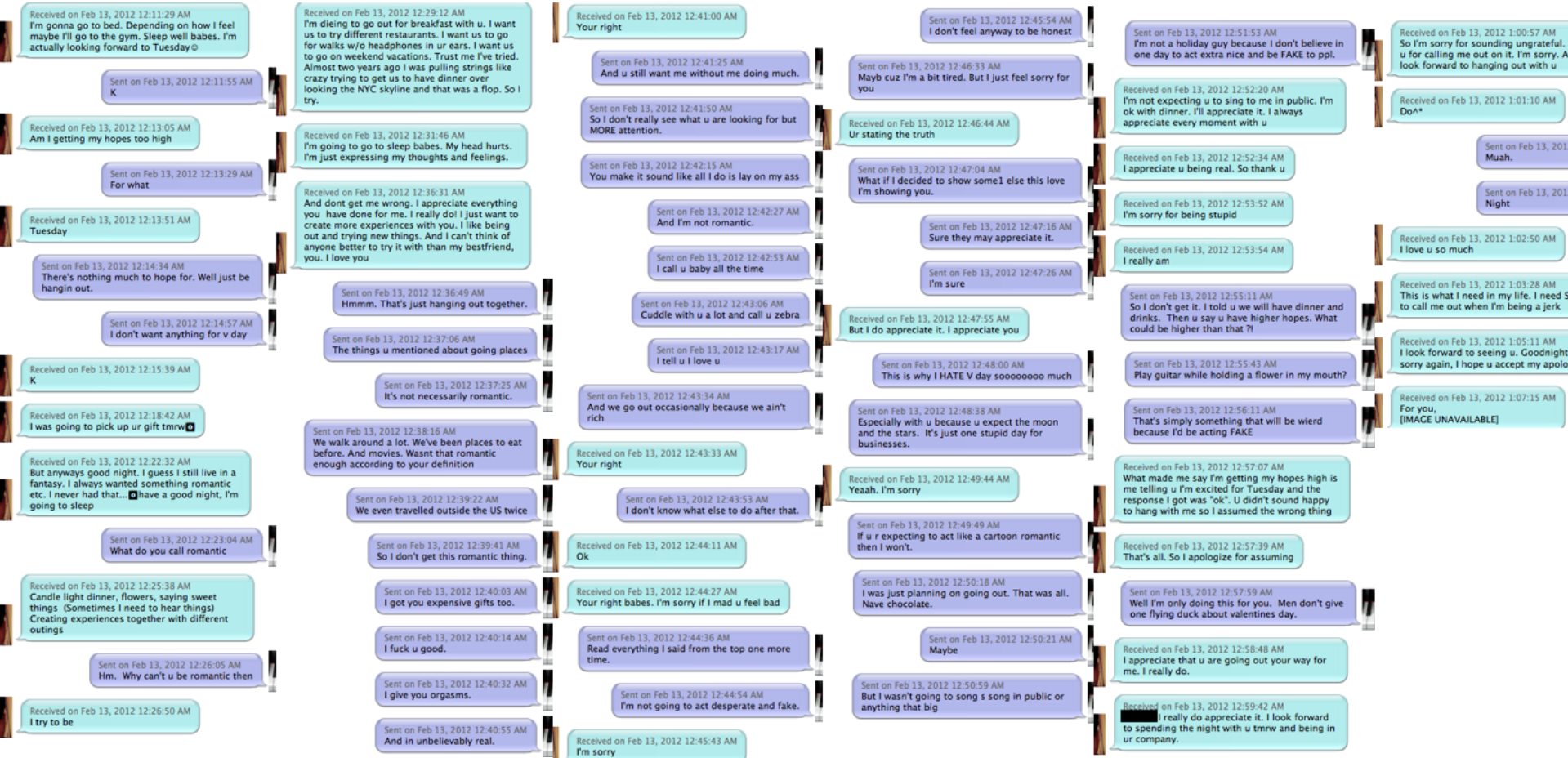 Anyways, enough with my ranting for now. Here is a conversation with one woman I was dating on and off. Notice how I put her in her place and then she thanks me for it.SHe realized that Valentines Day was actually driving us further apart due to its “expectations” for men to be super romantic that day. SHe is Light Blue and I am  the purple bubble.